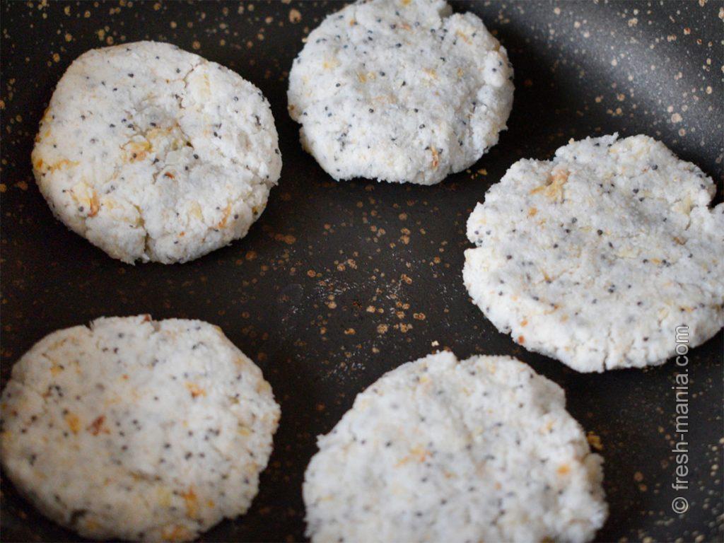 Тесто может быть рассыпчатым, но из него должны формироваться сырники. Если оно не плотное – выкладывайте на хорошо разогретую сковороду ложкой. Обжарьте “сырники” с двух сторон до румяной корочки на смазанной кокосовым маслом сковороде.